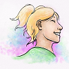 Description: A drawing of a smiling, light skinned black man with freckles and frizzy graying blond hair.